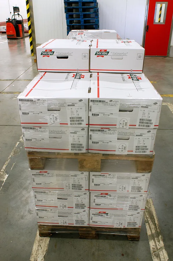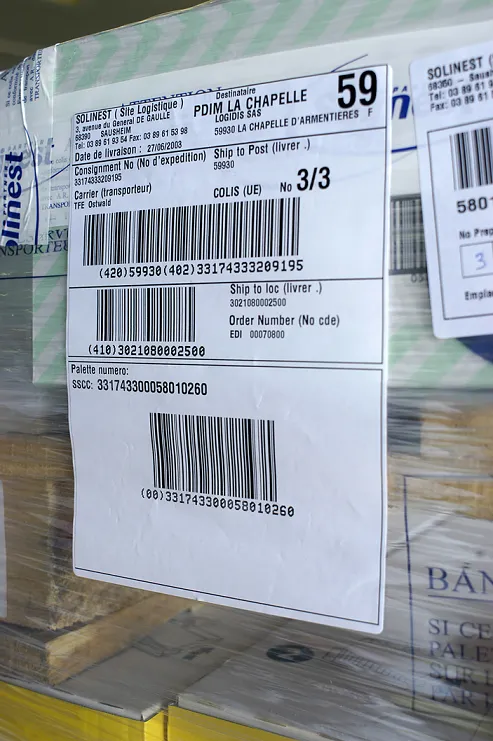 Pour les emballages tertiaires, comme une palette, vous devez encoder un GTIN-13 ou un GTIN-14 dans un code à barres de type GS1-128. Ces données sont imprimées sur une étiquette logistique GS1. Cette étiquette est collée sur la palette.